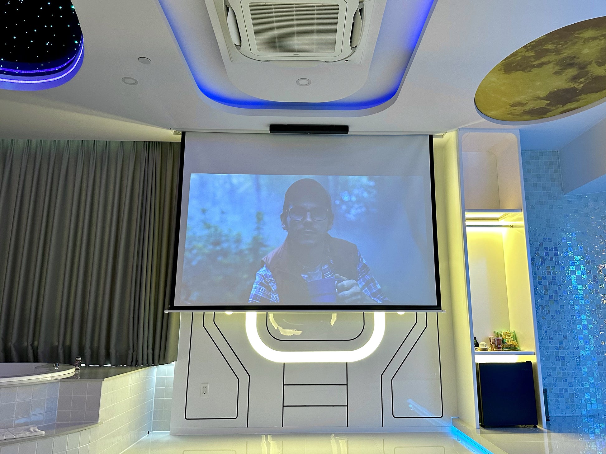 Đắm chìm trong thế giới hiện đại đầy mê hoặc, căn phòng mang phong cách phi thuyền không gian với giường tròn độc đáo, ánh sáng LED ấn tượng và thiết kế futuristic. Bức tường kính panorama mở ra tầm nhìn toàn cảnh thành phố lung linh, mang lại cảm giác vừa lãng mạn vừa choáng ngợp.